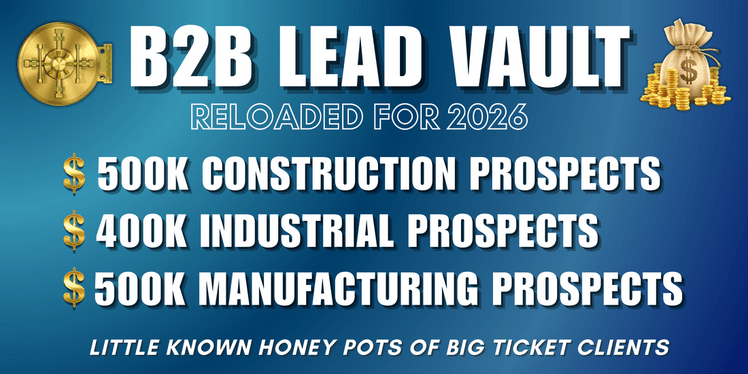 PLEASE READ: THERE's TWO FULL PRODUCTS HERE: As an Offliner, I'm always on the look out for good B2B information, I've keep my eye out in our marketplace and I haven't seen a thing! So knowing first hand about the incredible growth potential of doing business with that market (I was employed for almost 20 years as an advertising manager for a national B2B media company) IT'S TIME TO UPDATE ONE Of OUR TOP SELLERS "THE B2B LEAD VAULT - RELOADED FOR 2026"